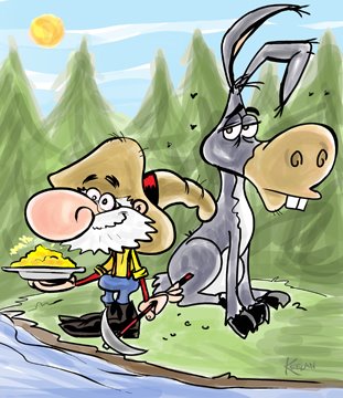 The Toony Bin’s character design challenge this week was for Cereal Mascots. I figured most people would do Toucan Sam, Snap Crackle and Pop, Tony the Tiger, stuff like that. So, I found a site that has tons of cereal mascots on it as a reference. I saw these two characters, Klondike Pete and his donkey, Thorndike, from a cereal I barely remember called Crunchy Nuggets. The original illos of them were pretty great, actually. I don’t think I improved on them one bit! LOL