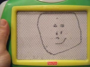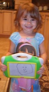 There must be something in the water in my house. Here’s my youngest daughter a few months ago… before her third birthday this month… with her self portrait. I was amazed when she picked up her “Magna Doodle” and when I asked her what she was drawing, she said “I Draw Me”. This is what she produced: