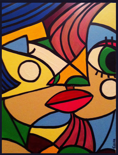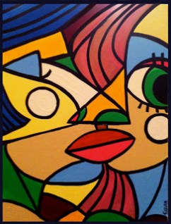 I love Picasso, cubism, Covarrubbias, Braque, lots of abstract stuff, so that’s what I like to paint. Here’s a recent one I did. I am doing a series of Biblical paintings, and this is the first. I call it “Tempted”. It’s of Adam and Eve in the Garden, kissing. Except that Eve is looking off at the Forbidden Fruit.